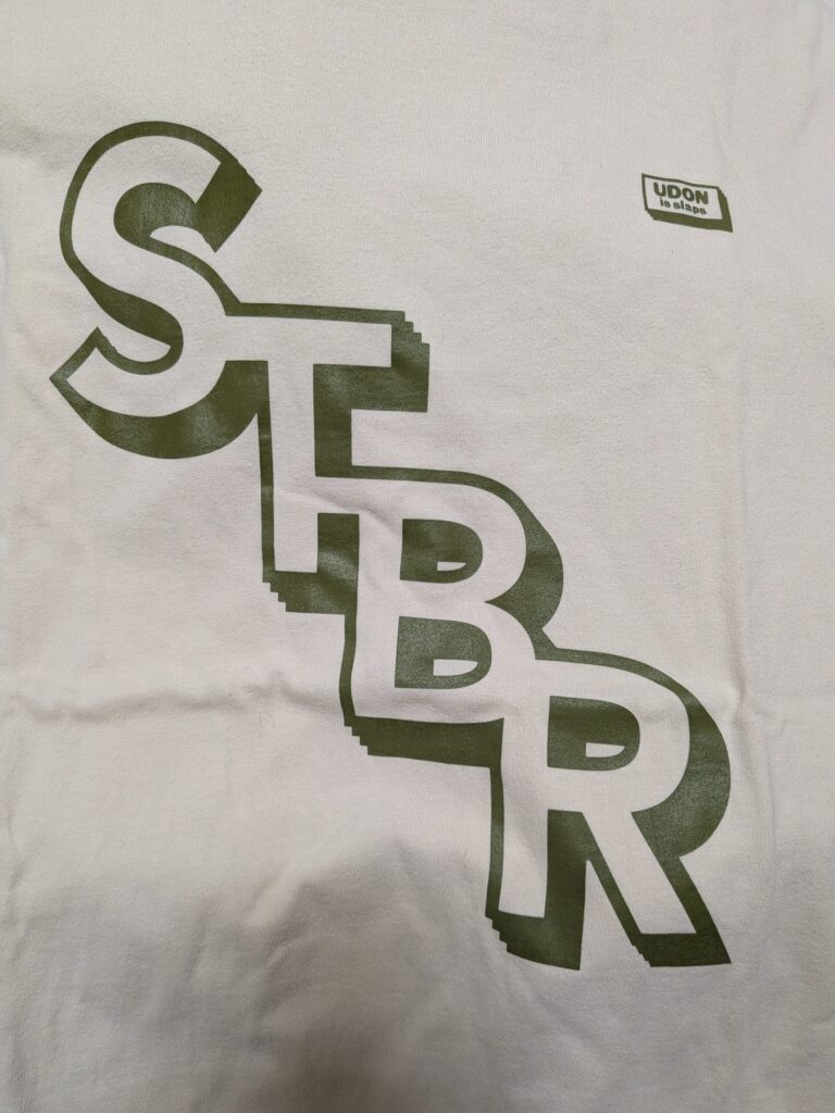 そしてうどんを待っている時、店内に置かれてある、Tシャツを見てサイズが合えば買ってしまいます。街ゆく人のTシャツにSTBRと書かれていれば、それは「SeToBaRe」と思って頂いて構いません